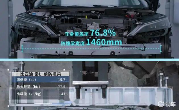 再看比亚迪秦L DM-i,它车身高强度钢的占比是70.8%。前防撞梁用的是高强度钢材质,横向宽度1460mm,车身覆盖率是76.8%。它也配备了四个吸能盒和副防撞梁,目的都是在碰撞时吸收和分散冲击力。