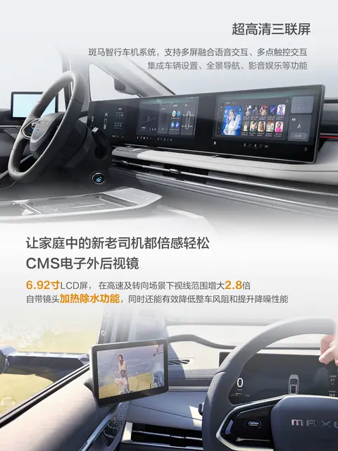 该车采用三块 12.3 英寸显示屏组成的悬浮式联屏,搭载 L2 + 级智能驾驶辅助系统,号称“智慧驾驶、影音娱乐互不干扰”。但入门悦享版取消标配 540 度全景影像(标配 360 度全景影像)。