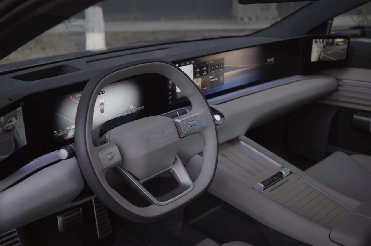 回归车内,与特斯拉Model 3的一“屏”如洗不同,它是用多种可视化的屏幕相互交互,用最大的视觉冲击力展示新能源时代的未来。巨大的59英寸超感广域屏横向悬浮于中控台之上,从驾驶席延伸至副驾,涵盖了后视镜、仪表盘、中控屏、副驾娱乐屏等多项功能,让设计、科技、功能同时实现。广域屏下方是“奥迪助手” ,基于火山引擎大模型打造的它,时不时能给你带来交互中的惊喜。你可以理解为这是一种“屏幕竞赛”,但自然语义交互AI会打破你对车机的传统认知。