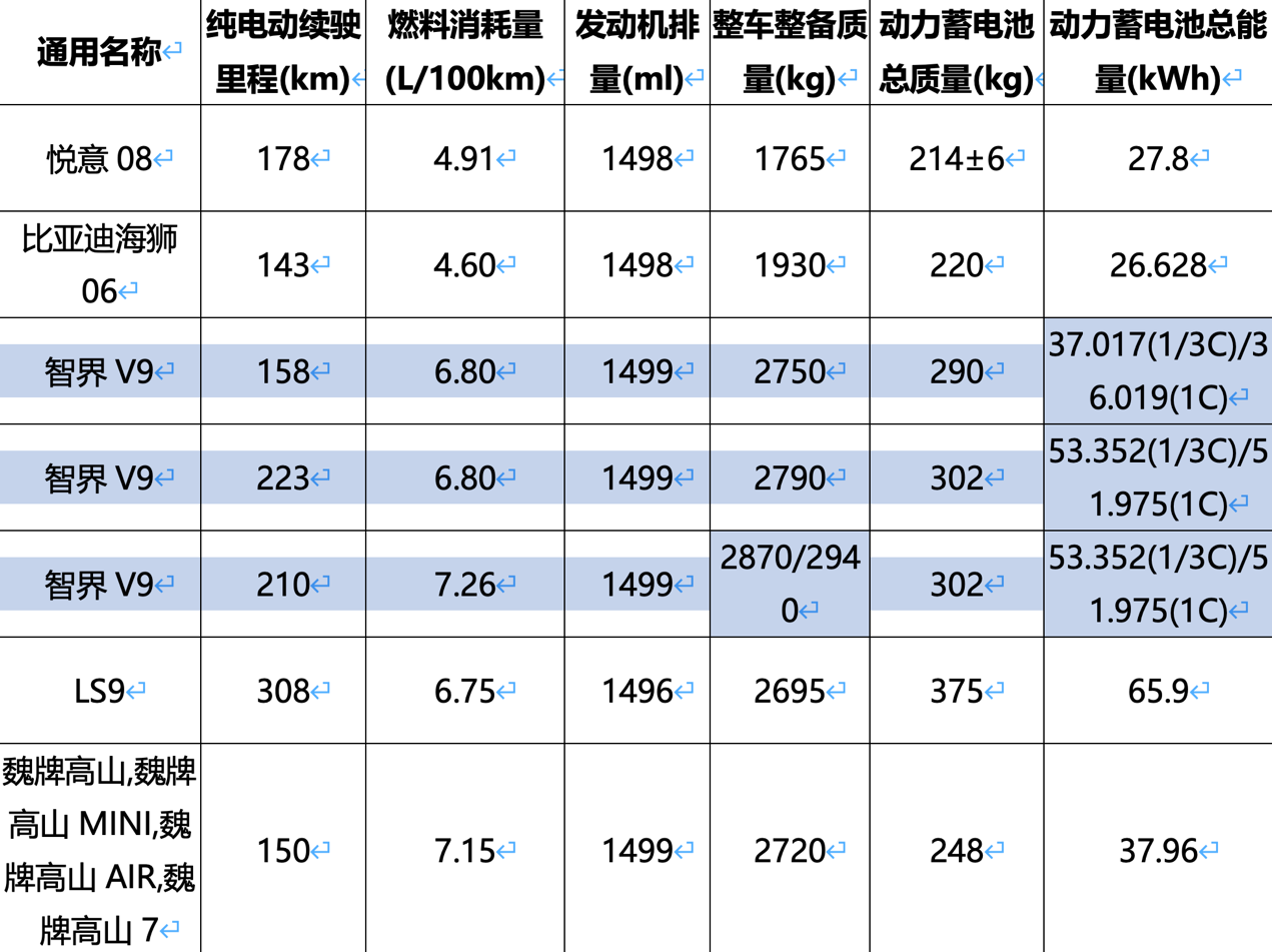 智界V9,并未通过此次工信部申报电机功率,所以我们只能从能耗与整备质量做推测,新车或配备两款单电机版本,以进一步提升续航表现。