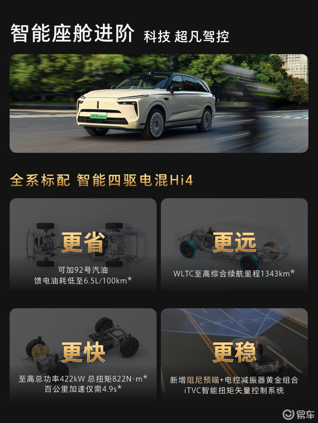 Hi4性能版,是全球首创的四挡全速域直驱技术。在路上的表现可概括为:跑得省、跑得远、跑得快、跑得稳。在4.9秒零百加速性能的同时,还能达成6.5L/100km的超低馈电油耗,更能带来1343km综合续航。并通过前后50:50轴荷分配与iTVC智能扭矩控制,为全家出行提供了从容安稳的驾乘体验。真正实现了“四驱的性能,两驱的花费”。