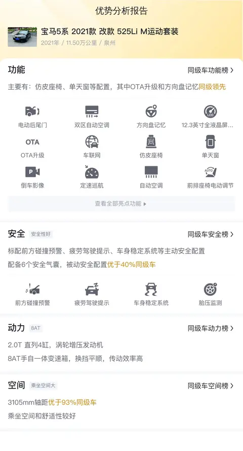 该车具体版本为——宝马5系 2021款 改款 525Li M运动套装,上牌地为泉州,上牌日期2021年4月,表显里程11.50万公里,新车指导价42.19万,二手车报价19.38万,过户次数2次。支持分期购车,首付5.81万即可开回家。