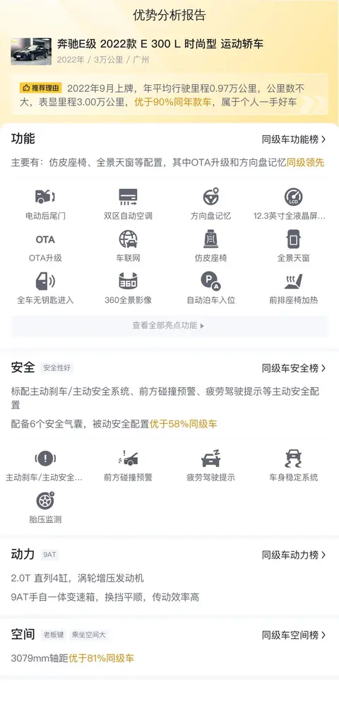 这辆奔驰E级2022款E 300 L时尚型运动轿车,属于中大型轿车,车身颜色为绿色,车源地与上牌地均为广州,上牌时间为2022年9月,至今行驶了3万公里,0过户,车况良好。新车指导价为47.99万元,而现在的二手车报价为32.3万元,经济适用,性价比高。